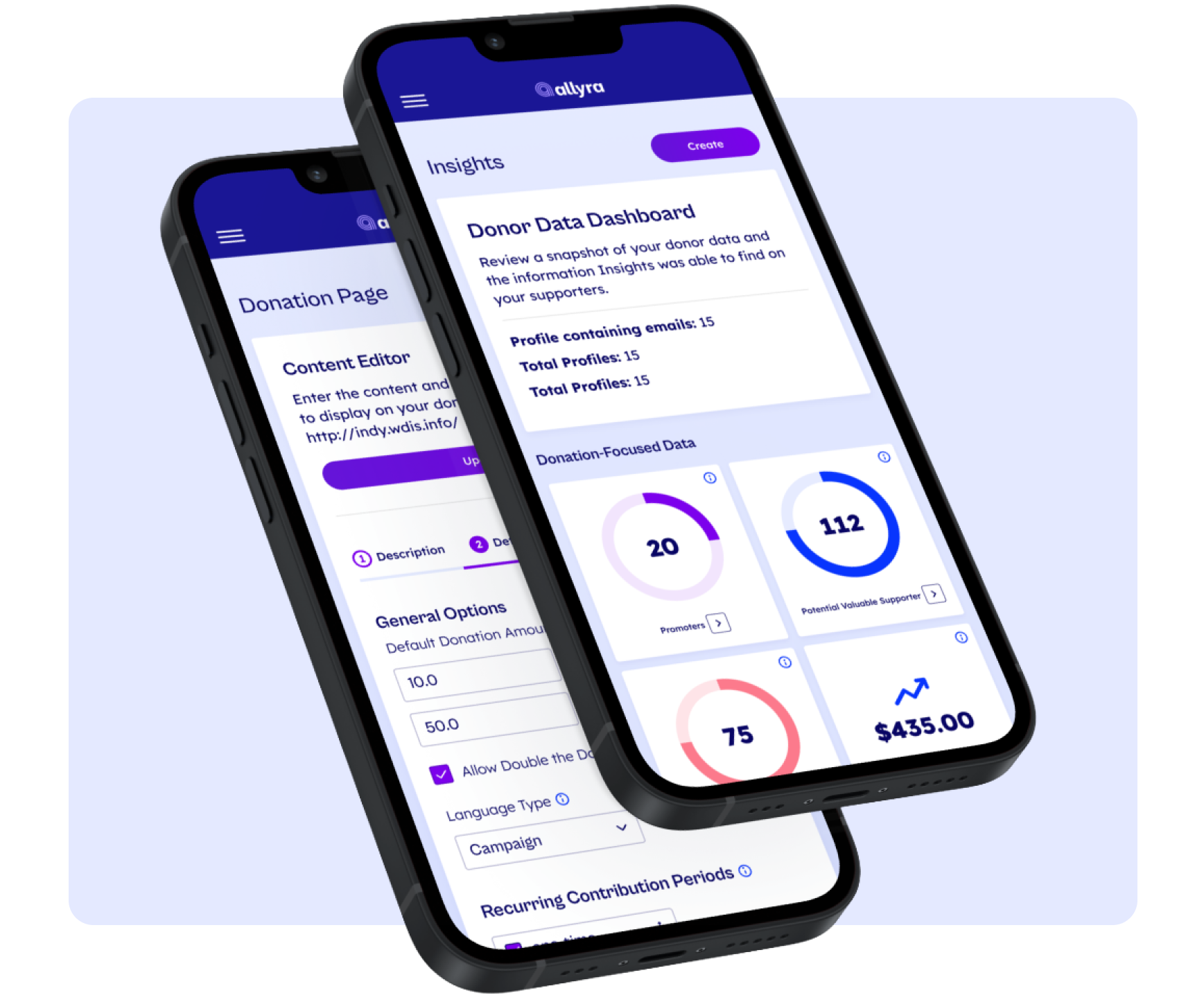 Allyra’s optimized fundraising tools, including mobile giving forms, text to donate, and peer-to-peer pages, help your nonprofit raise funds online.
