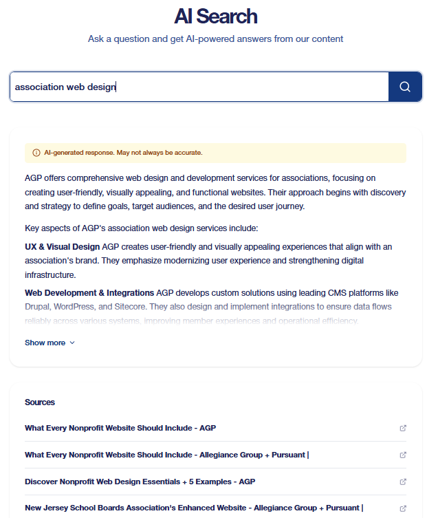 We’ve embraced that idea by using an AI Search on our own website so that associations and nonprofits can easily find what they are looking for. Unlike the version of AI search you see on Google, this AI search crawls only our content to formulate the best answer.