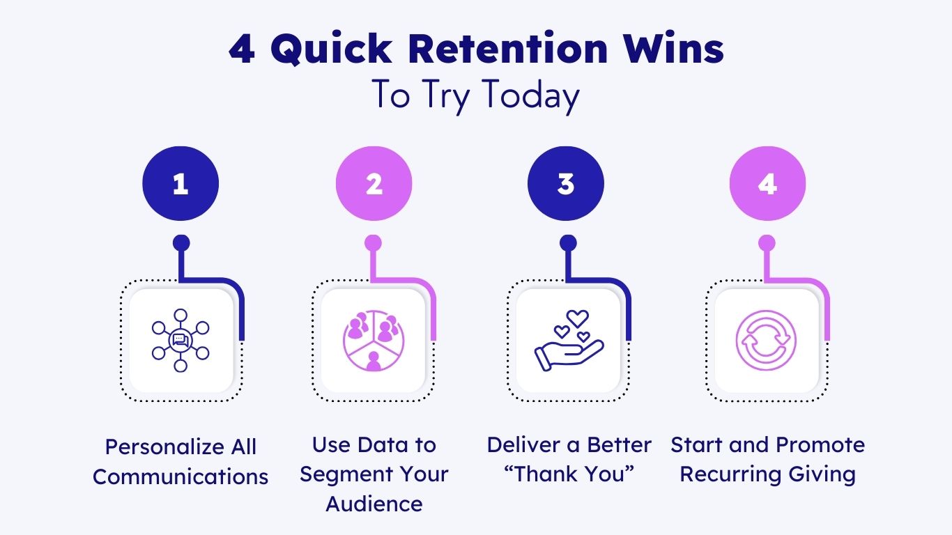 The good news? You don’t need an elaborate retention plan to make an impact. Start with these four quick tips to turn one-time donors into lifelong supporters.