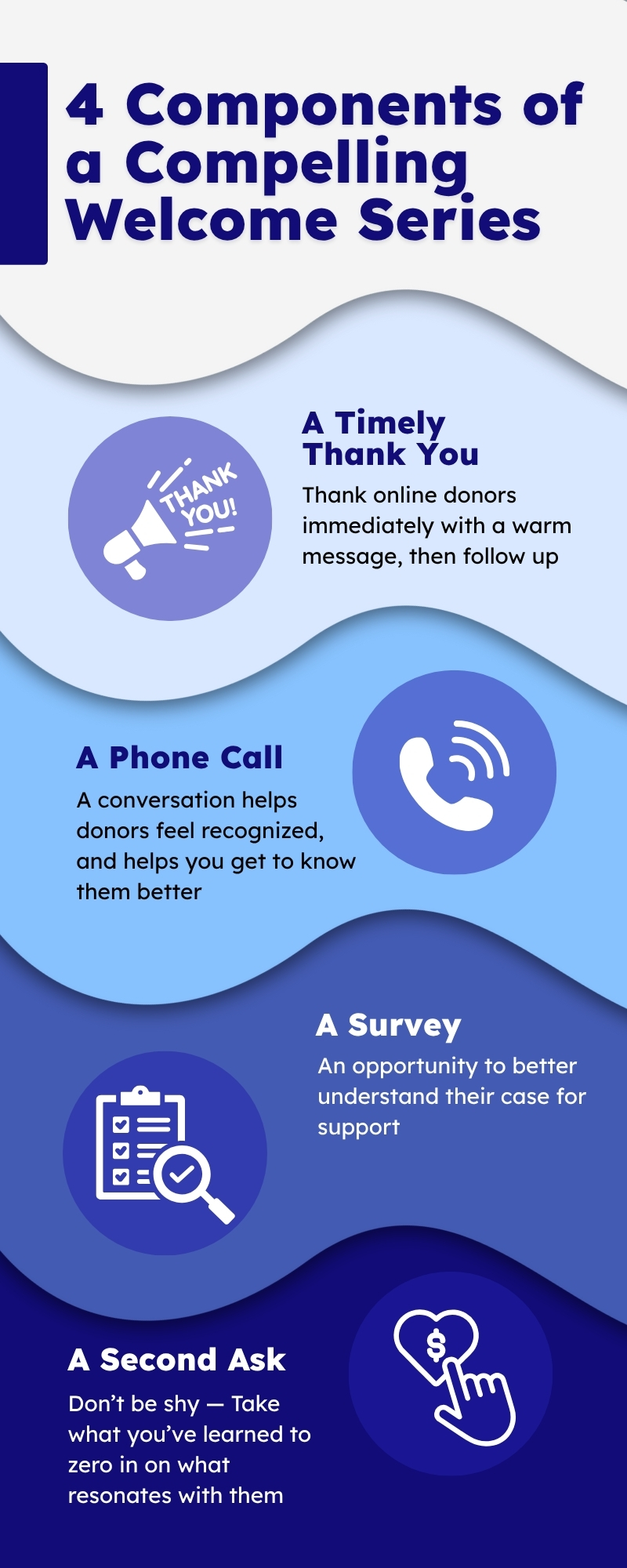 The care and attention you show as you welcome new donors is their first look at your stewardship experience, so it’s essential to make a good impression. Let’s explore the elements of a compelling welcome series, which is ideally spread over 45–60 days.