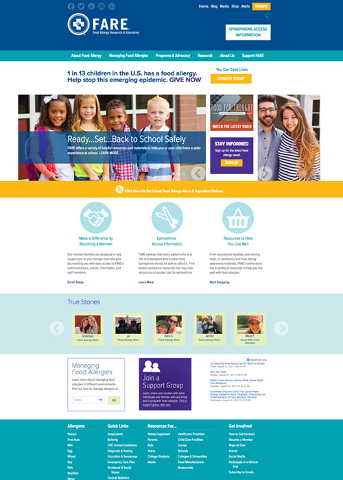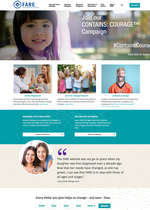 We worked with FARE on a total website redesign for foodallergy.org, including new organization of information, design, content strategy, and CMS. Our goal was to design a site that gave site visitors the information they needed and helped FARE achieve their goals including providing easy to find life improving information, optimizing online donation flow, and increasing user actions and engagement.
