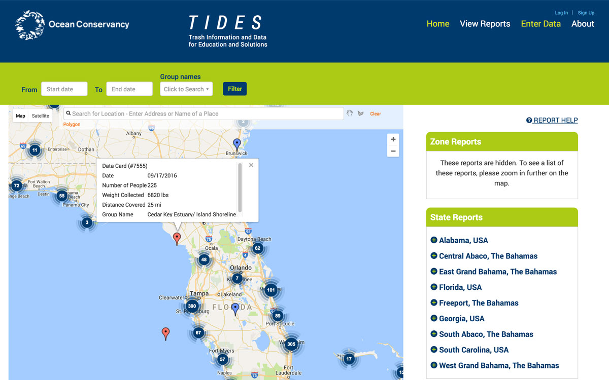 All of the data is submitted directly to the Ocean Conservancy database, TIDES, also developed by Allegiance Group + Pursuant (see below). The online database receives data from both manual data entry and the Clean Swell app. Data visualization via integration with Google Maps shows the worldwide impact of the International Coastal Cleanup and volunteers around the globe. Location-based reporting and analytics provide deeper insights into data.