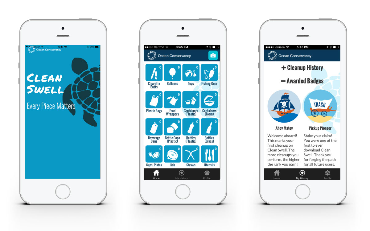 Clean Swell, available in iOS and Android, also provides tools for social sharing and awards badges to encourage participation. Distance, time, and route are tracked via GPS. Co-branded versions of the app are available for Ocean Conservancy partners, with geofencing to define partner territories. The Clean Swell app enables volunteers to enter trash collection data in real time.